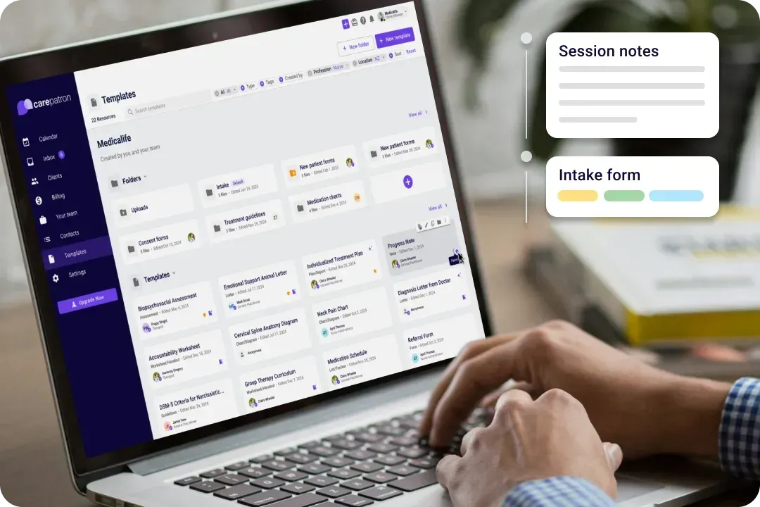 Carepatron offers a secure and compliant EHR system that keeps patient records organized and easily accessible. Clinicians can store treatment notes, assessments, care plans, and progress updates all in one place.