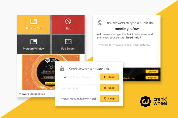 One of the central capabilities of CrankWheel is the ability to initiate a screen sharing session quickly. The presenter typically generates a link that the viewer can open in a browser. Because the viewer does not necessarily need to install additional software, the process may reduce friction during spontaneous demonstrations.